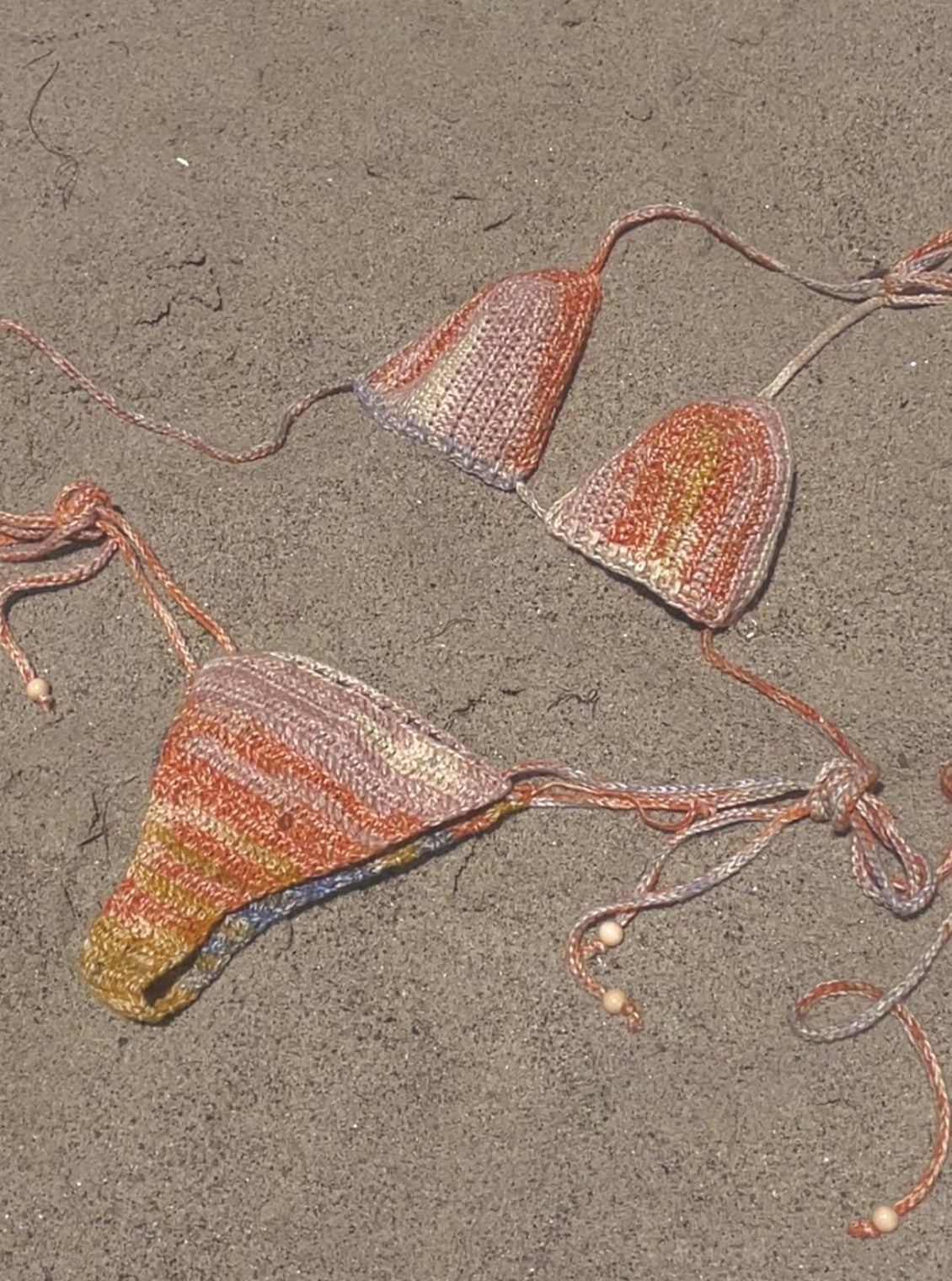 Made to mimic sunset and pink auras, the Aura Rosa top is handmade with love using a multicolor yarn with ranging hues of peachy pink to deep blues. Our Aura Rosa top is creating using a half double-crochet design in the classic triangle silhouette, but able to be tied in six different ways. Accented with small cutouts and wooden beads, the Aura Rosa top is the perfect choice to lounge around during sunset year round!